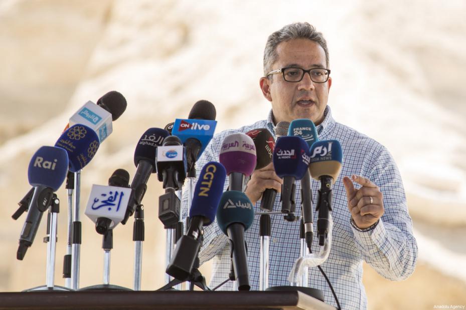 - El ministro de Antigüedades de Egipto, Jaled al-Enani, durante su discurso tras las excavaciones de las tumba de los 8 faraones, de 3.000 años de antigüedad en Minia, Egipto, 24 de febrero de 2018 [Ibrahim Ramadán / Agencia Anadolu]