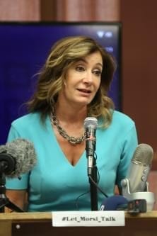 La directora para Medio Oriente y África del Norte en Human Rights Watch, Sarah Lean Watson durante una conferencia en la que exigió la libertad del ex presidente de Egipto, Mohammed Morsi, en Nueva York, EEUU, el 23 de agosto de 2017 [Mohammed Elshamy / Agencia Anadolu ]
