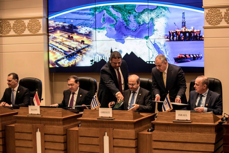 El ministro israelí de Energía, Yuval Steinitz (R), el ministro griego de Energía, Kostis Hatzidakis (2º R), el ministro egipcio de Petróleo, Tarek el-Molla (2º L) y el ministro chipriota de Energía, Yiorgos Lakkotrypis (L), asisten al Foro del Gas del Mediterráneo Oriental (EMGF), en El Cairo, el 16 de enero de 2020 [KHALED DESOUKI/AFP via Getty Images].